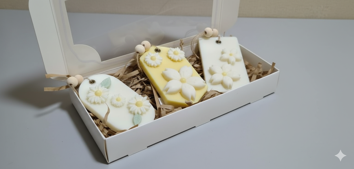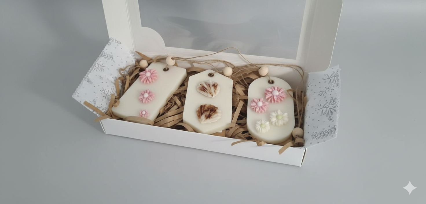 Cada sachet está elaborado en cera aromática sólida y decorado con detalles florales de cera en relieve, creando una pieza estética y funcional que aromatiza mientras decora. Gracias a su formato colgante, puedes ubicarlos fácilmente en clósets, cajones o rincones especiales del hogar.